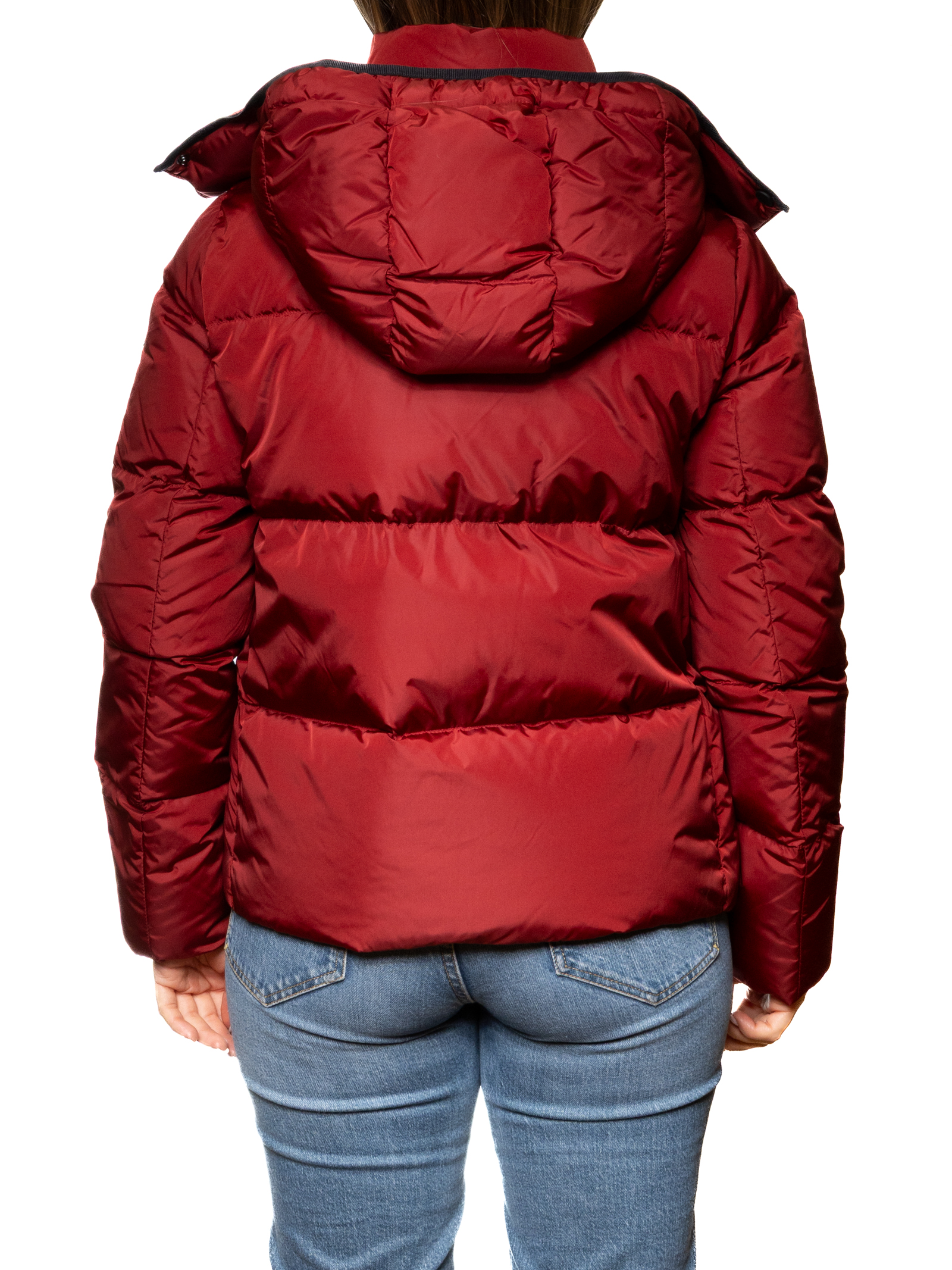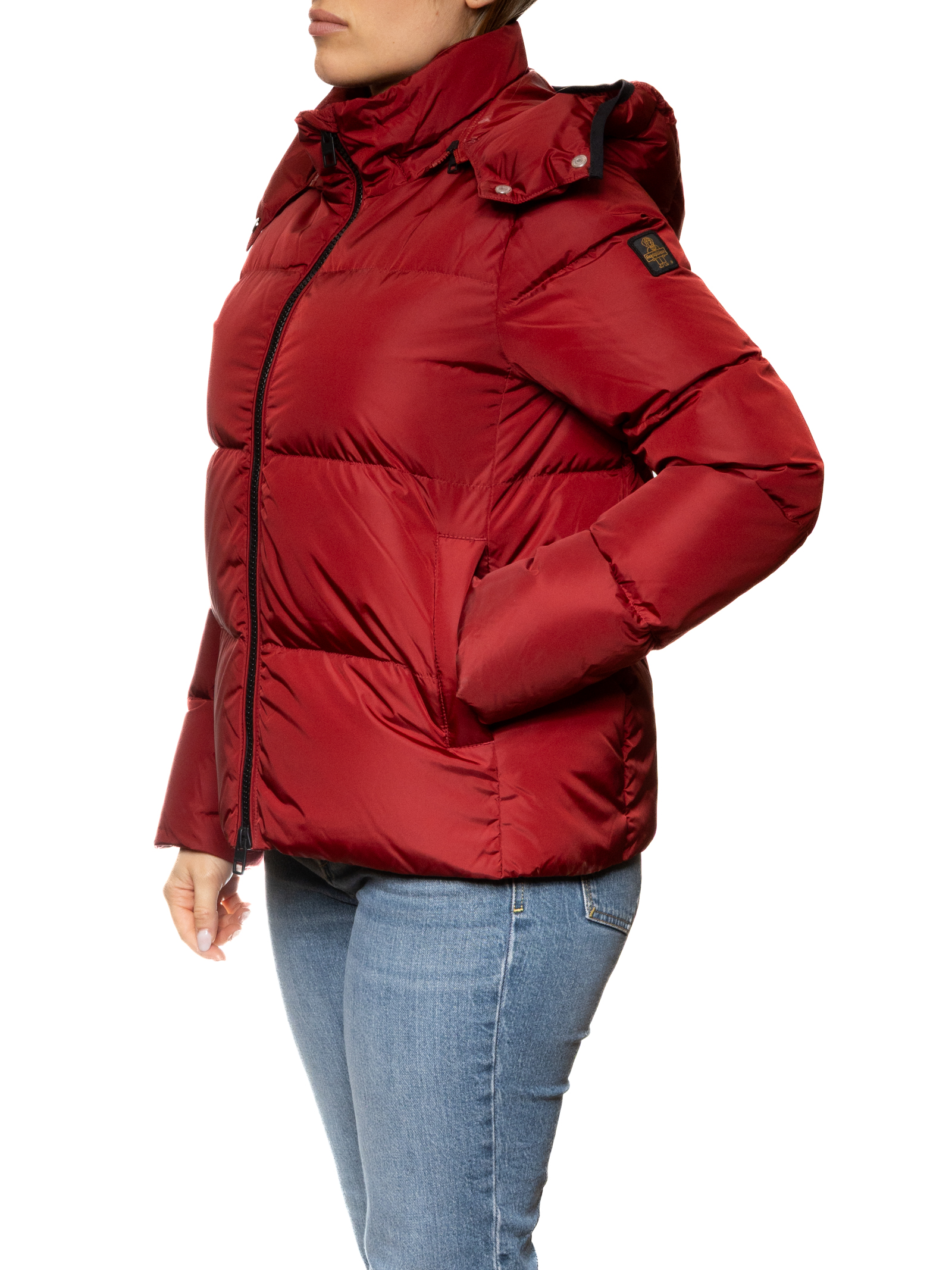 Piumino in in nylon satinato. Chiusura con zip doppio cursore. Imbottitura in piuma. Antivento. Collo alto. Cappuccio removibile. Tasche laterali con zip. Fit leggermente over. Logo sulla manica.