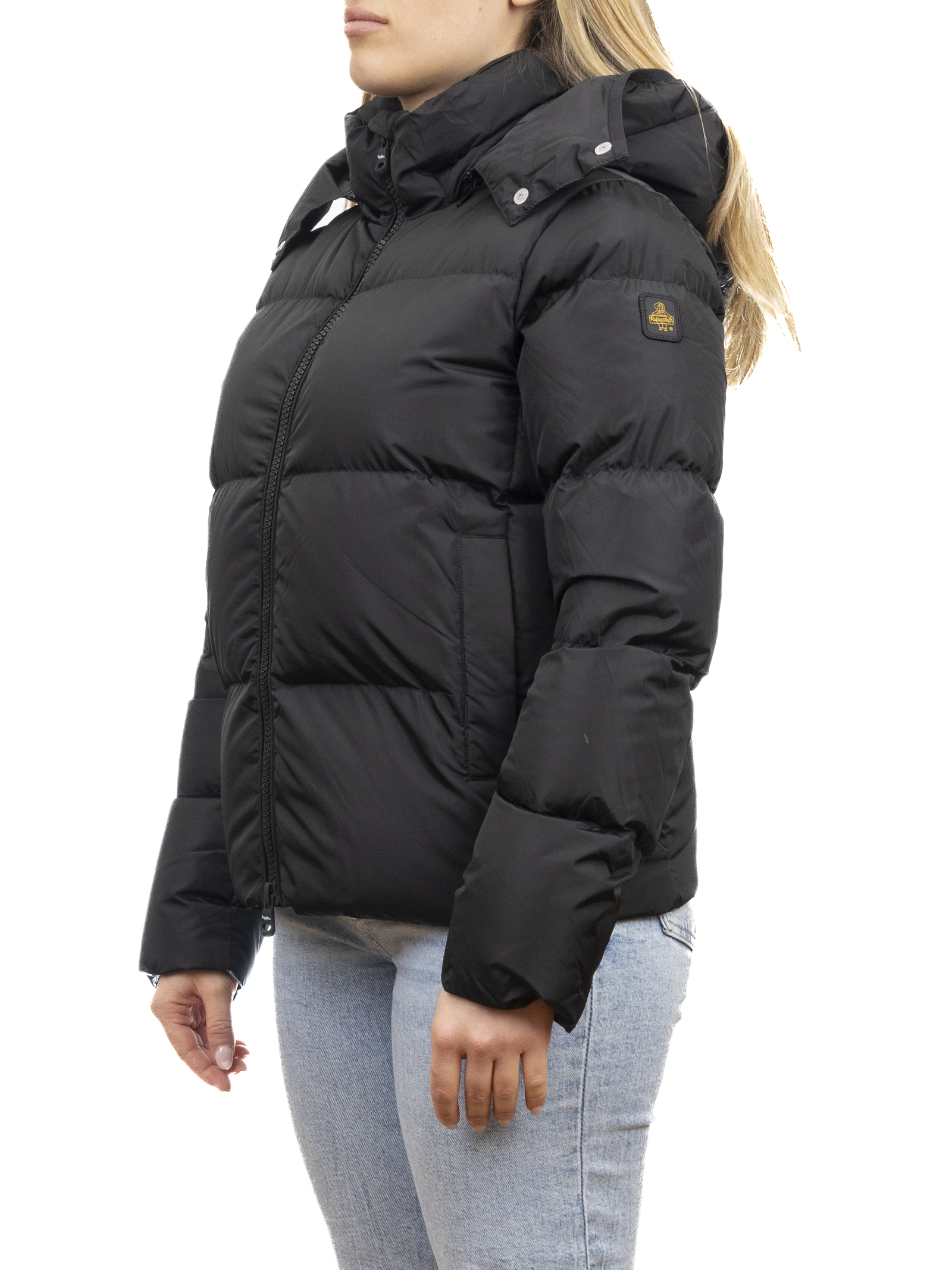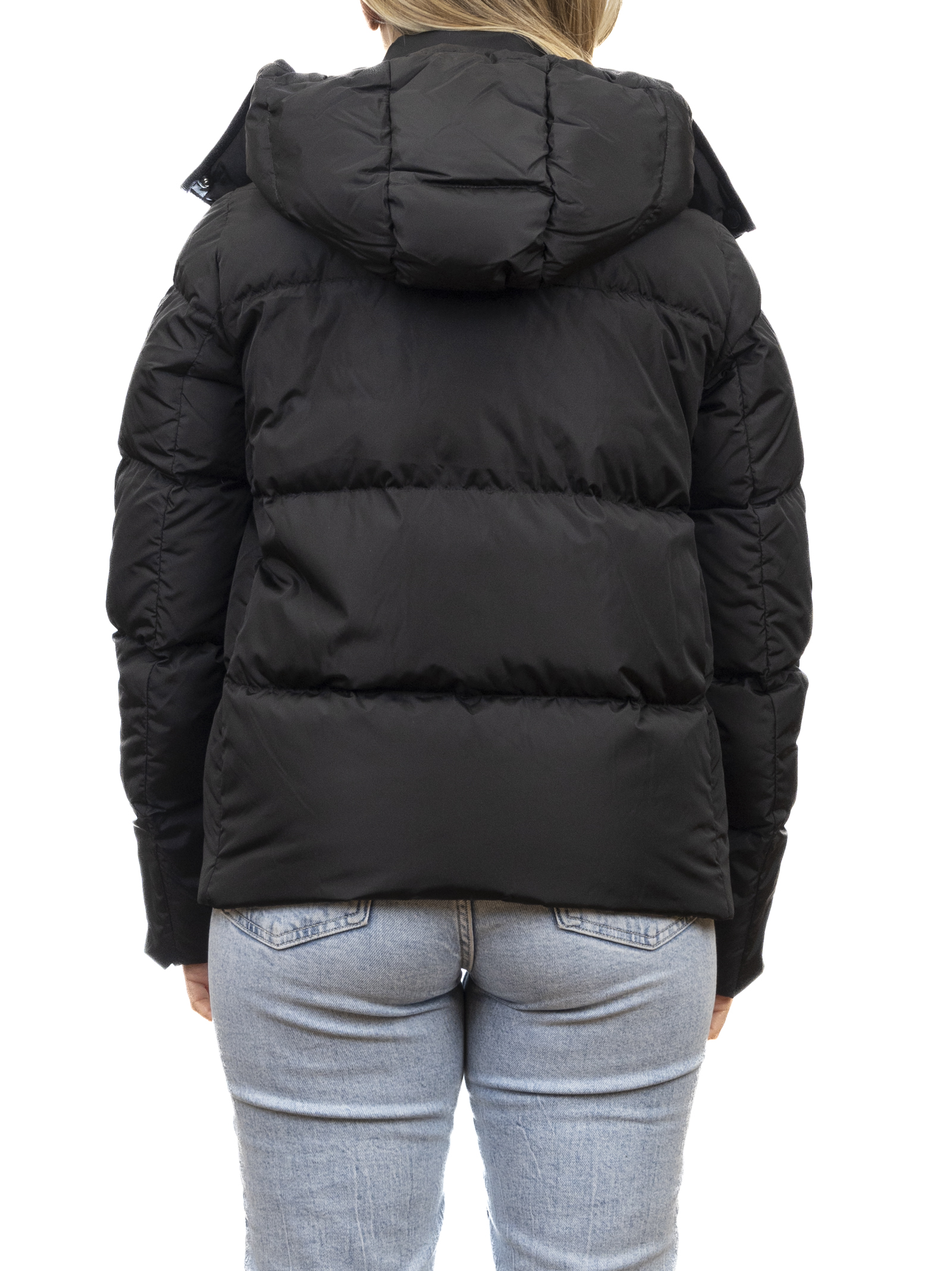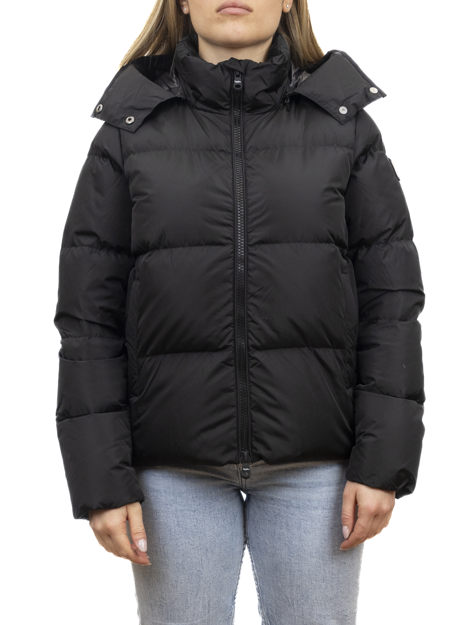 Piumino corto da donna dal design moderno e pulito, caratterizzato da un colore nero luminoso e facile da abbinare. L' imbottitura calda e leggera, distribuita in ampie trapuntature orizzontali, assicura comfort termico e massima libertà di movimento.