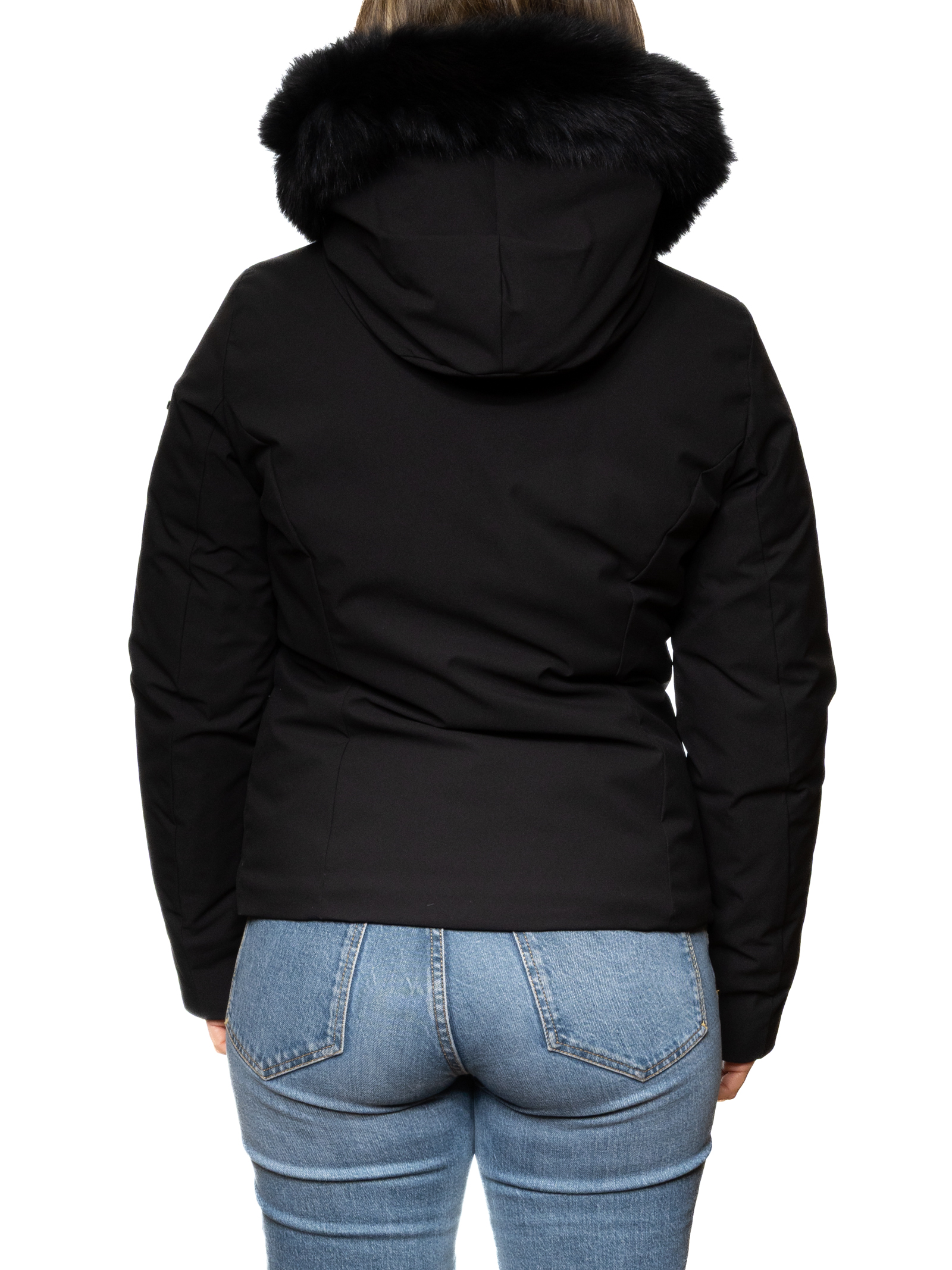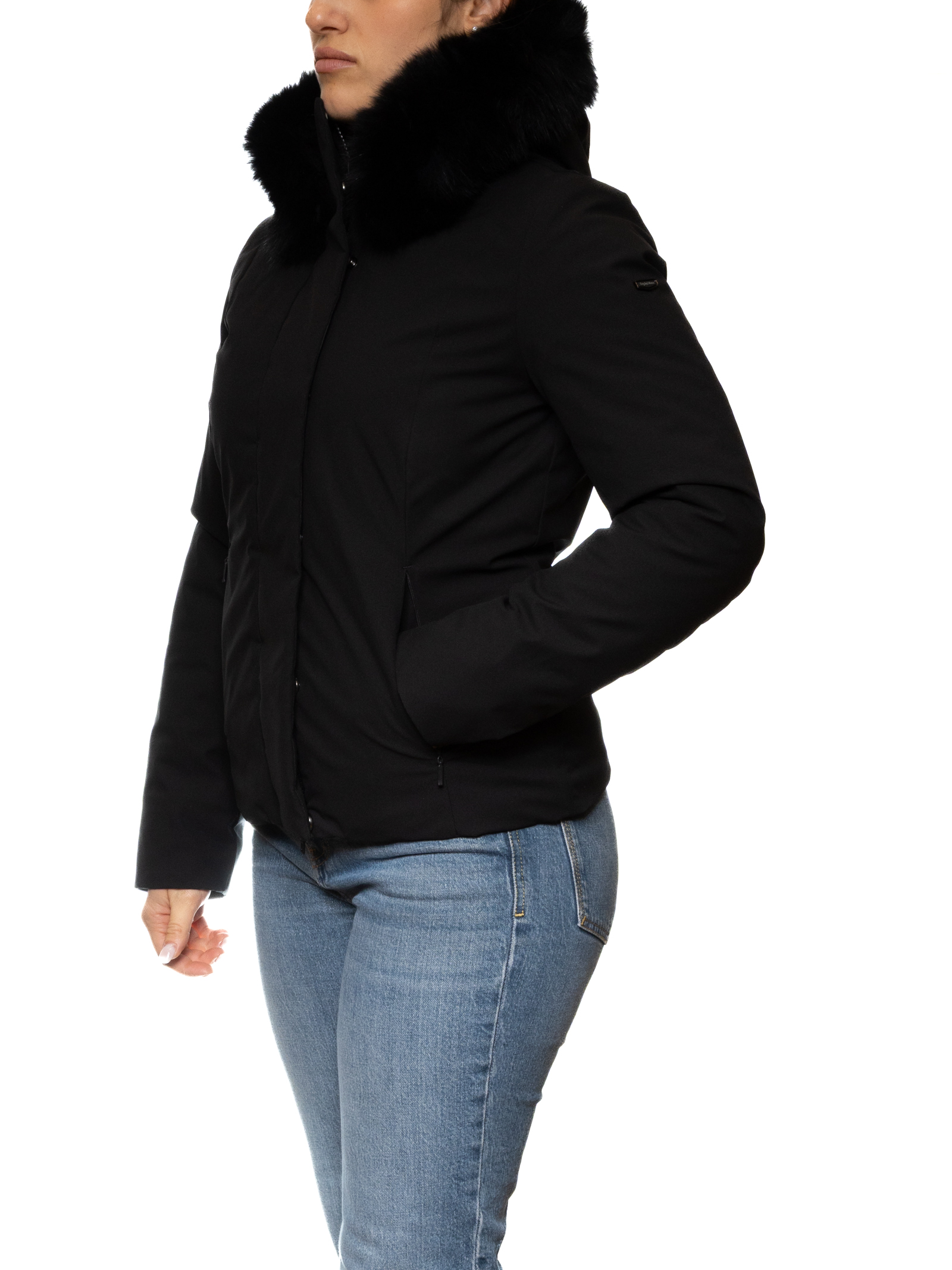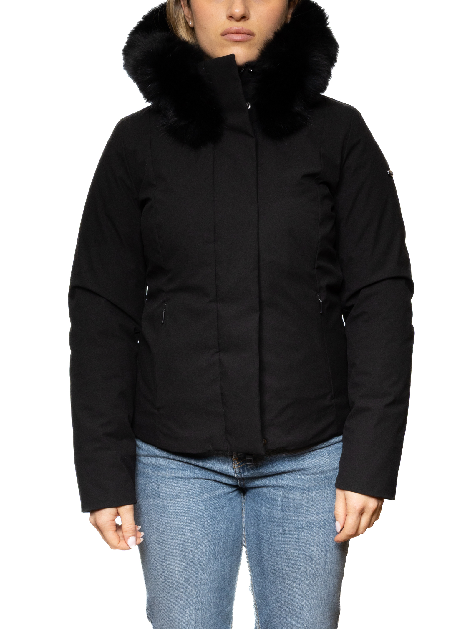 Il cappuccio dotato di pelliccia nera voluminosa e morbida aggiunge un tocco elegante e femminile, ideale per impreziosire qualsiasi outfit invernale. La chiusura frontale con zip coperta da patta antivento offre una protezione ottimale nei giorni più freddi.