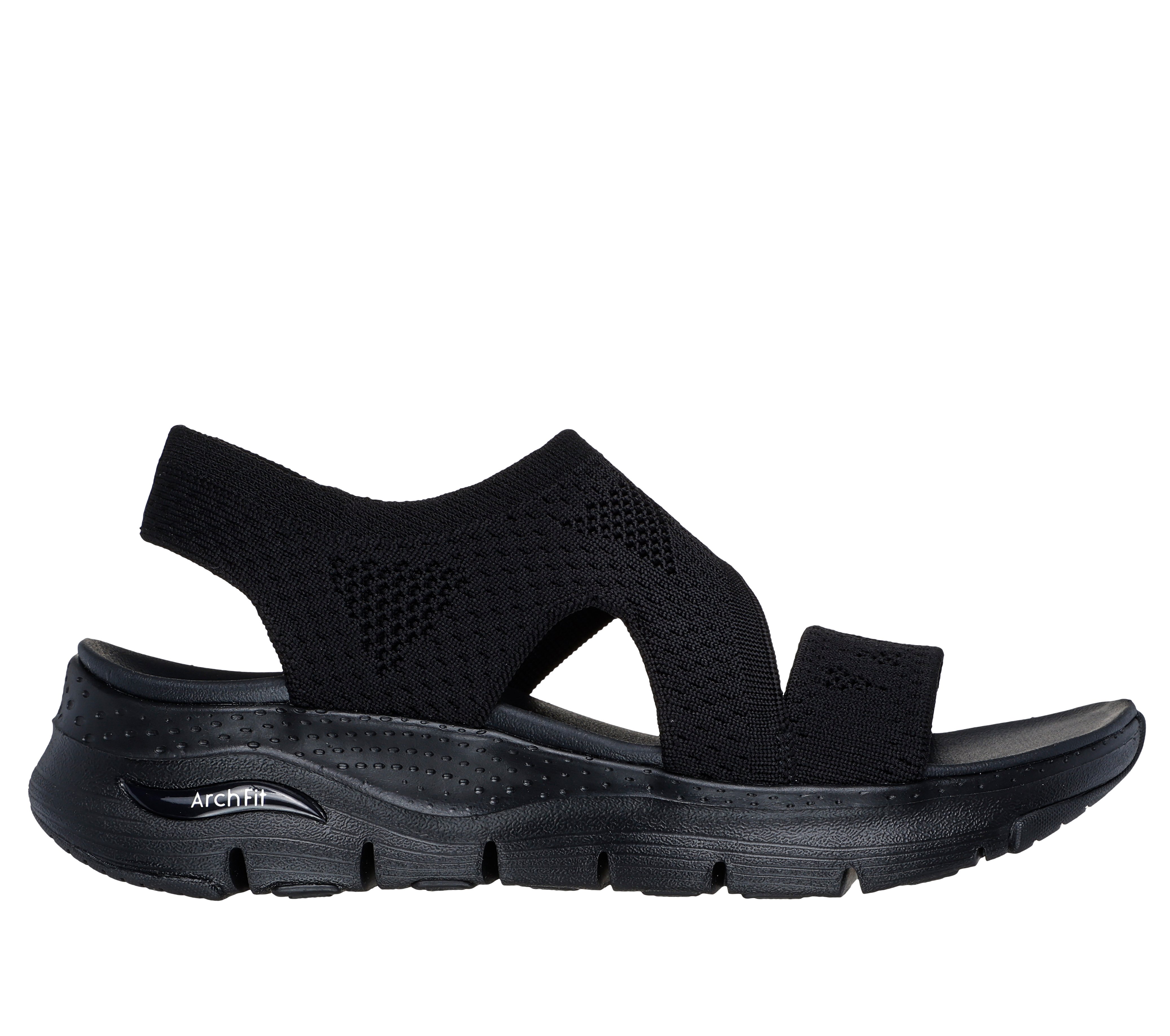 Sandalo in tessuto elastico. Tecnologia ArchFit. Vegan friendly. Suola flessibile e leggeria con Traction Grip. Altezza zeppa 45mm
