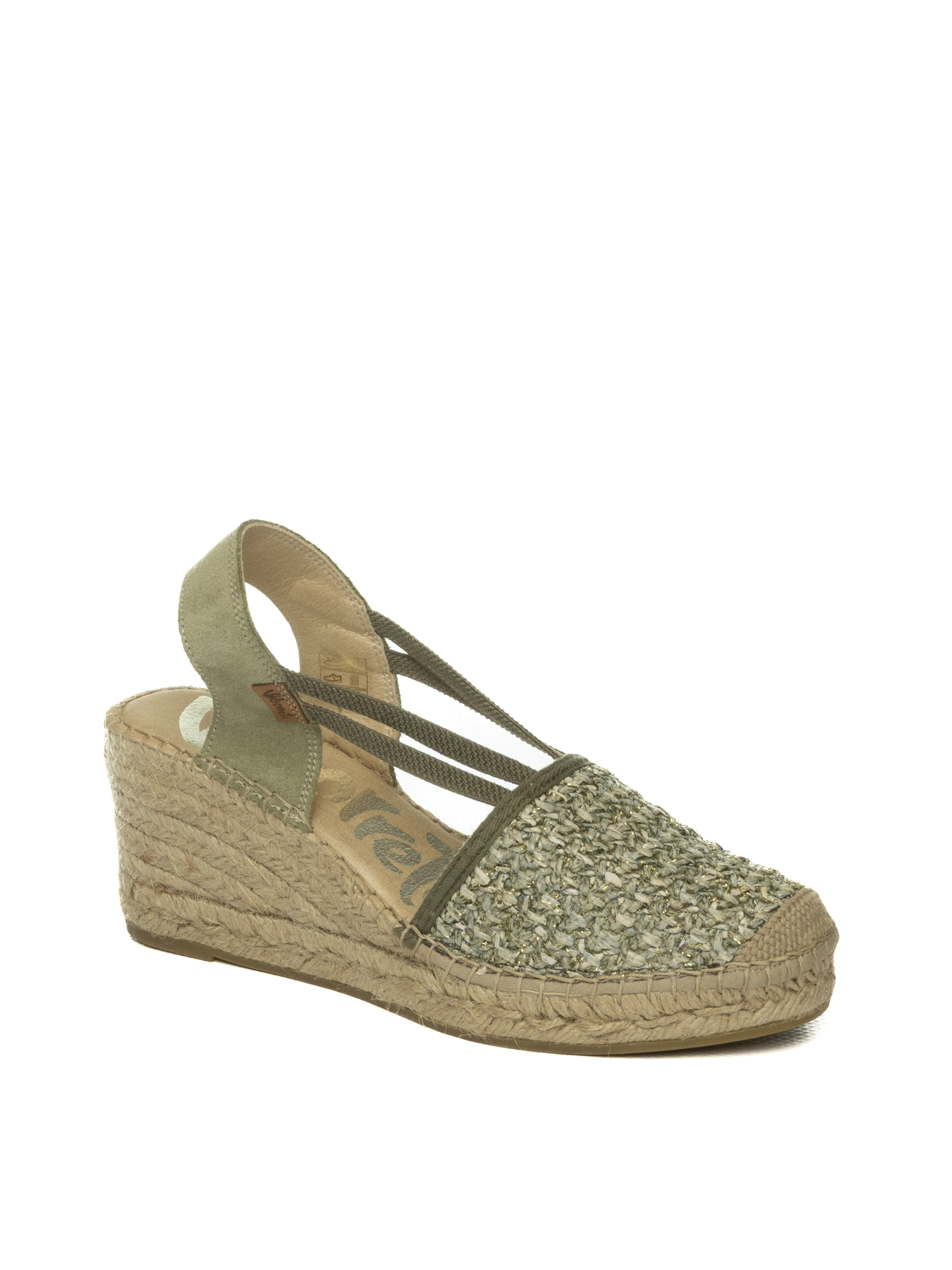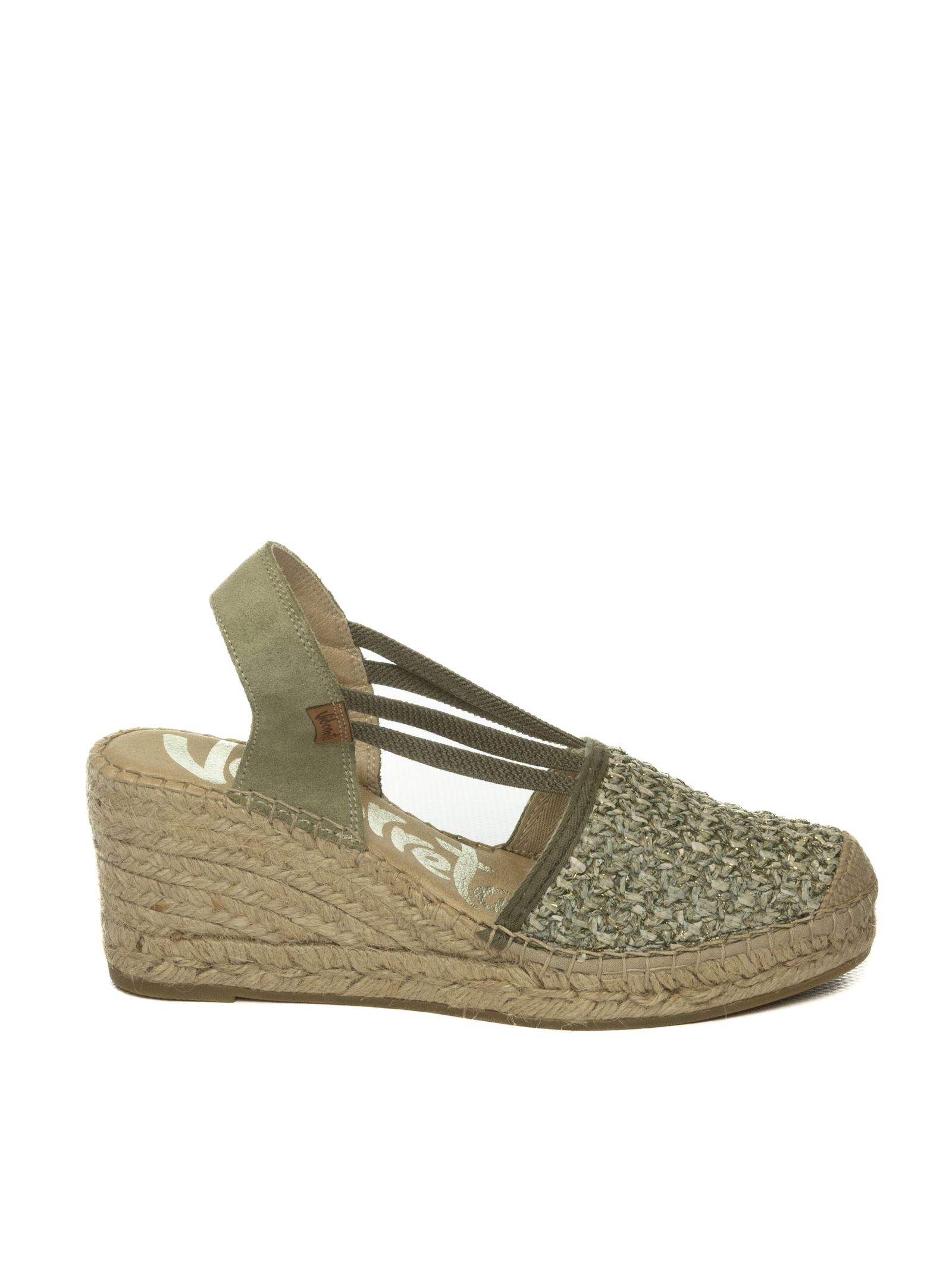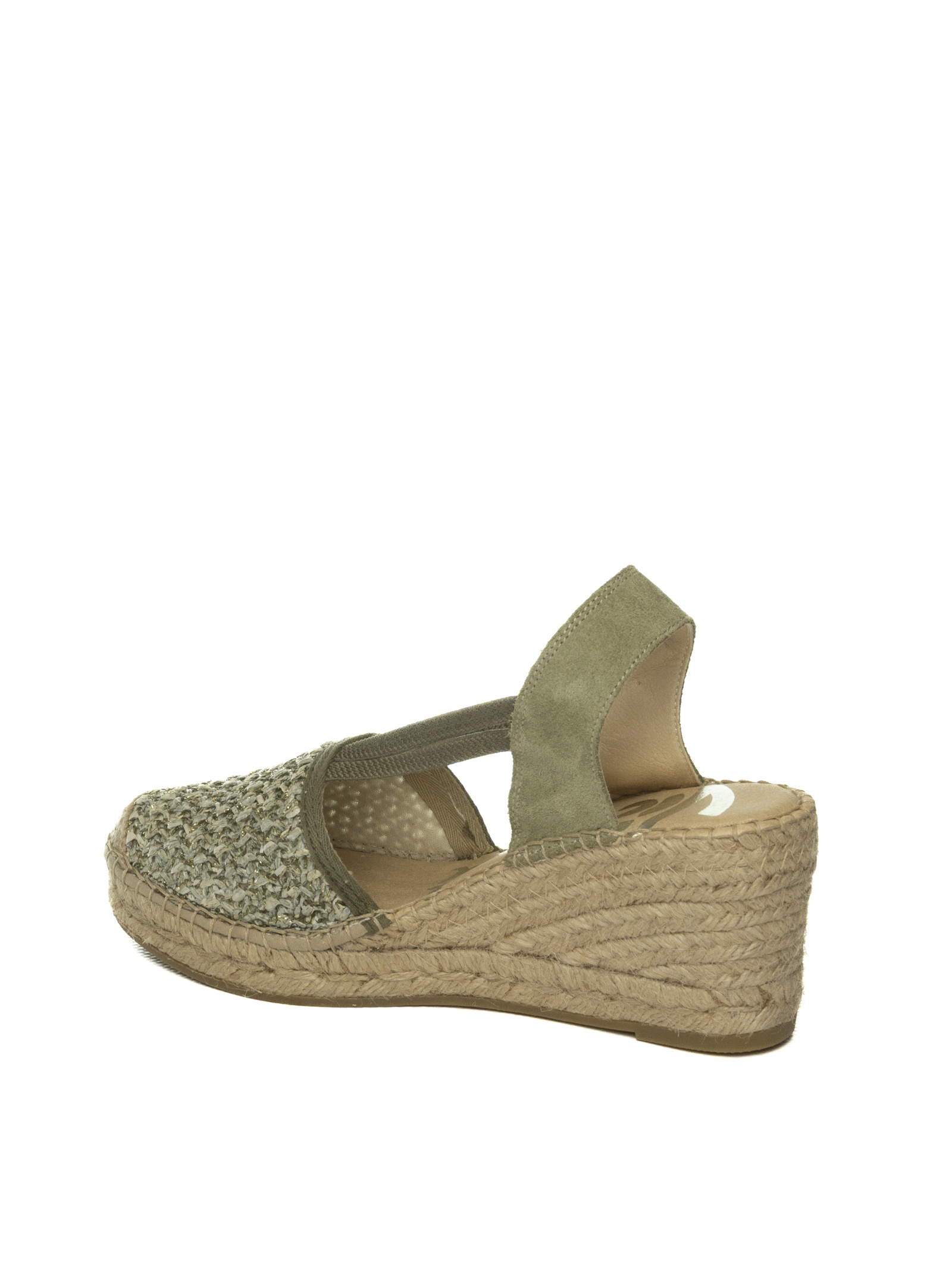 Espadrills in raffia. Chiusura con fasce elastice. Soletta imbottita. Suola in gomma. Zeppa in corda intreecciata. Altezza zeppa 80mm. Altezza plateau 30mm. Made in Spain