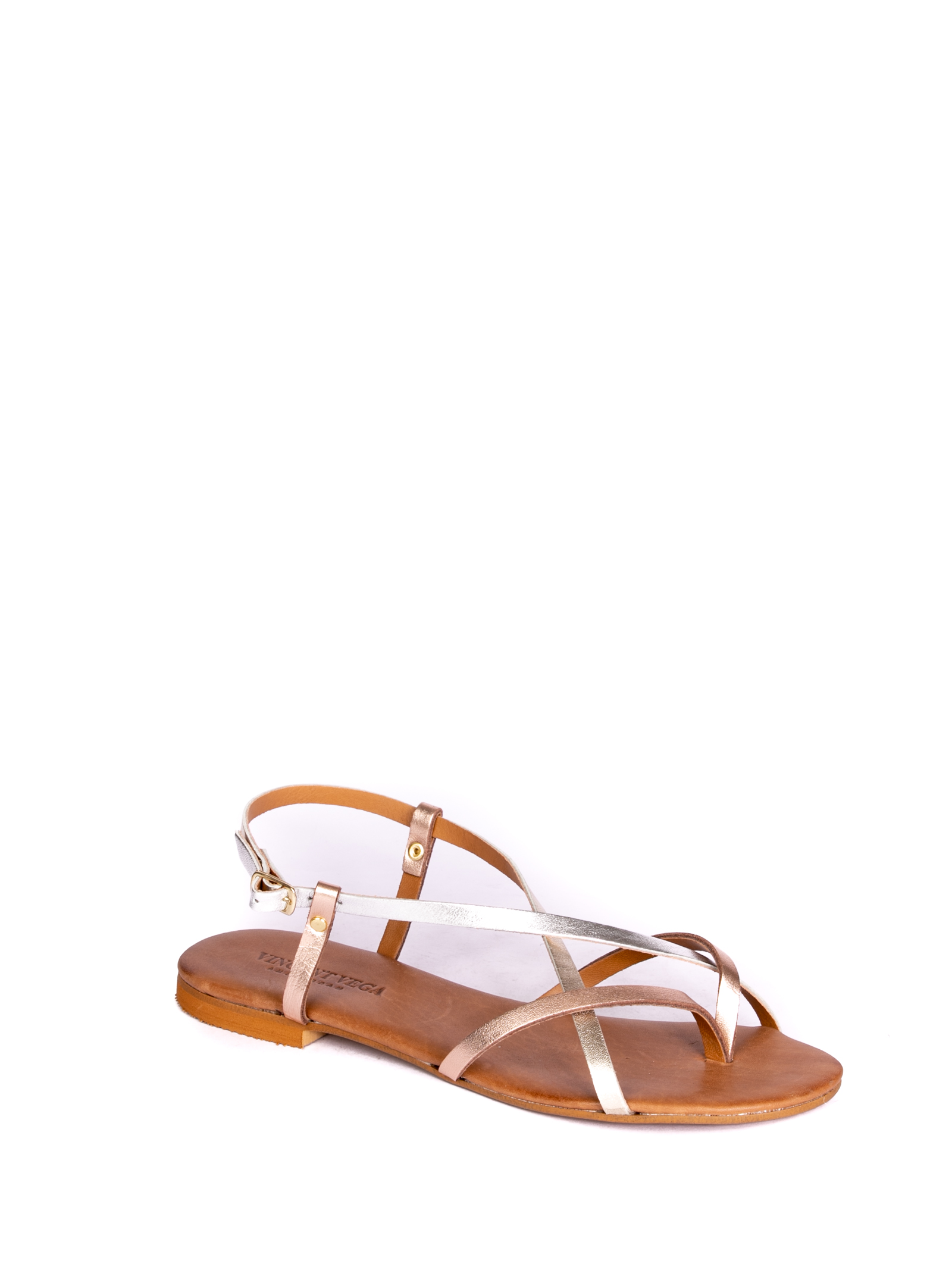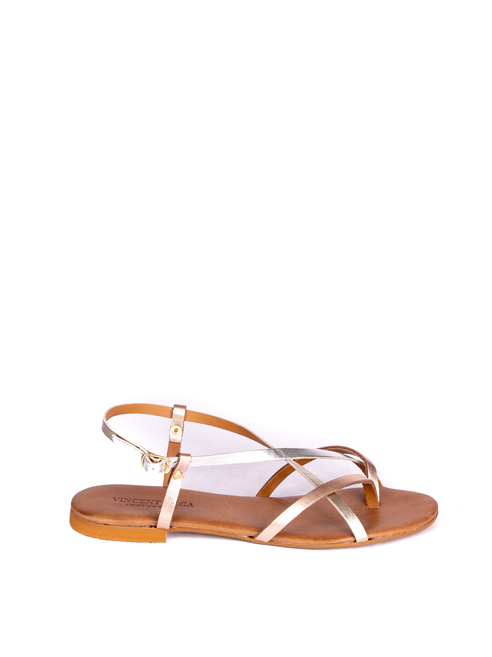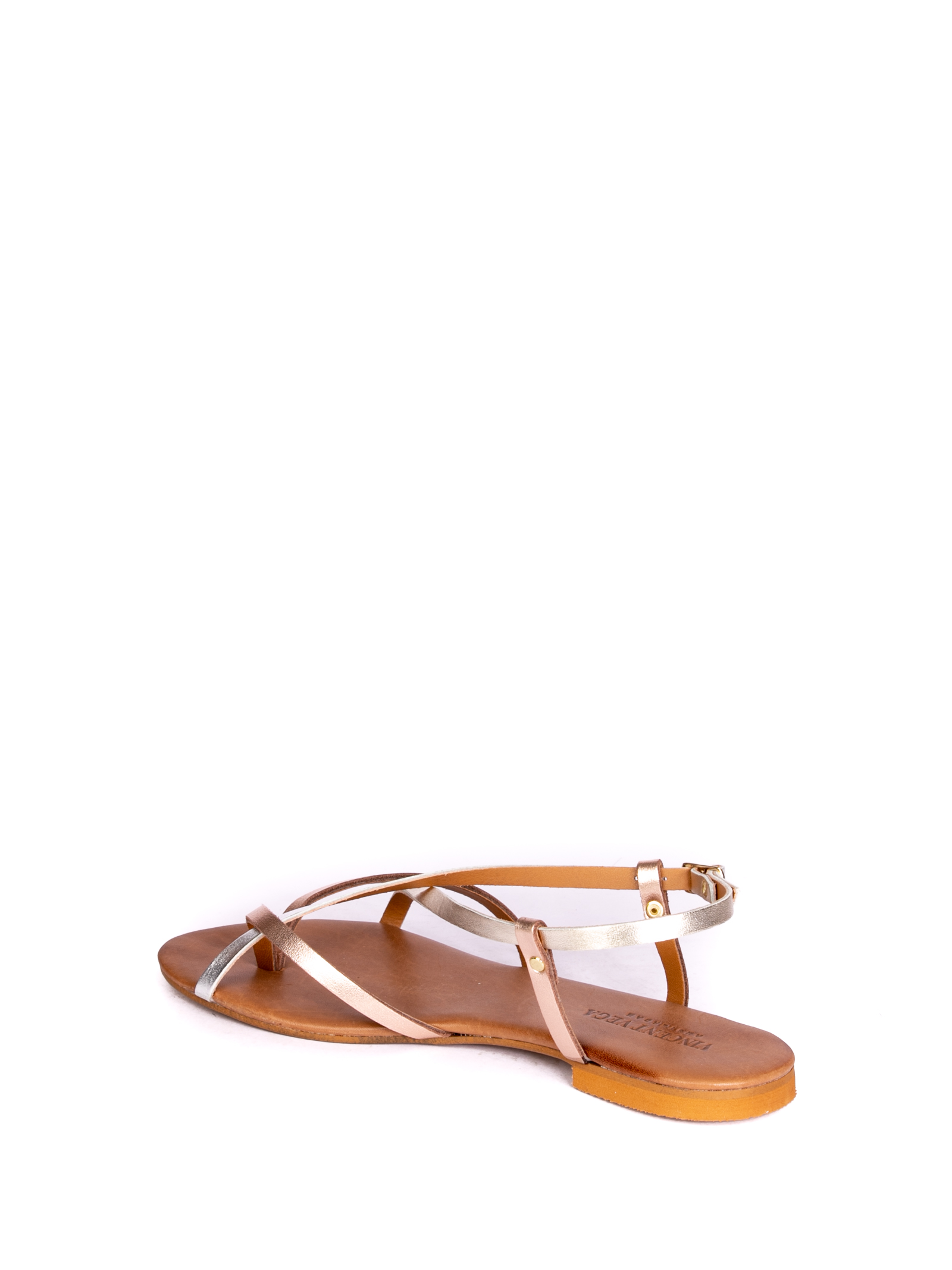 Sandalo con fasce in pelle laminata. Sottopiede in pelle. Fondo cuoio. Made in Italy